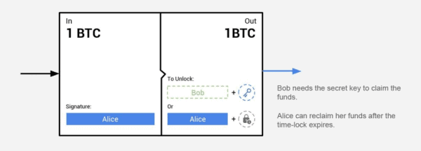 In the example below, Alice put 1 BTC into the contract with Bob. Bob can either take the 1 BTC out if he gets the hash from Alice within a predefined time, or Alice will get the funds back automatically after that predefined time has past.