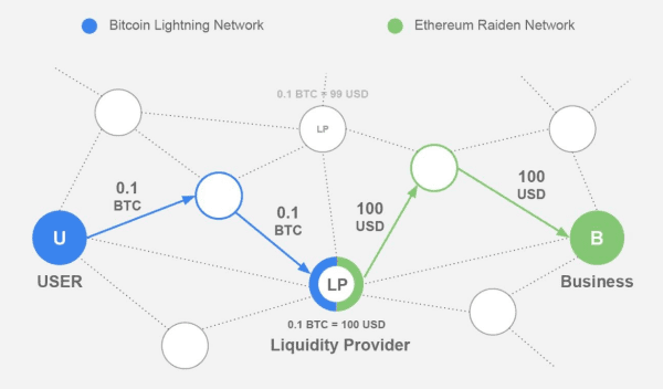 In layman’s terms, this would mean that if Bob wants to send Alice 1 BTC and wants ETH in return, they could open two payment channels (one with BTC and the other with ETH) and couple them with a hash h. Bob sends Alice BTC as long as she sends him ETH. In case either one backs out, the original amounts would just be returned.