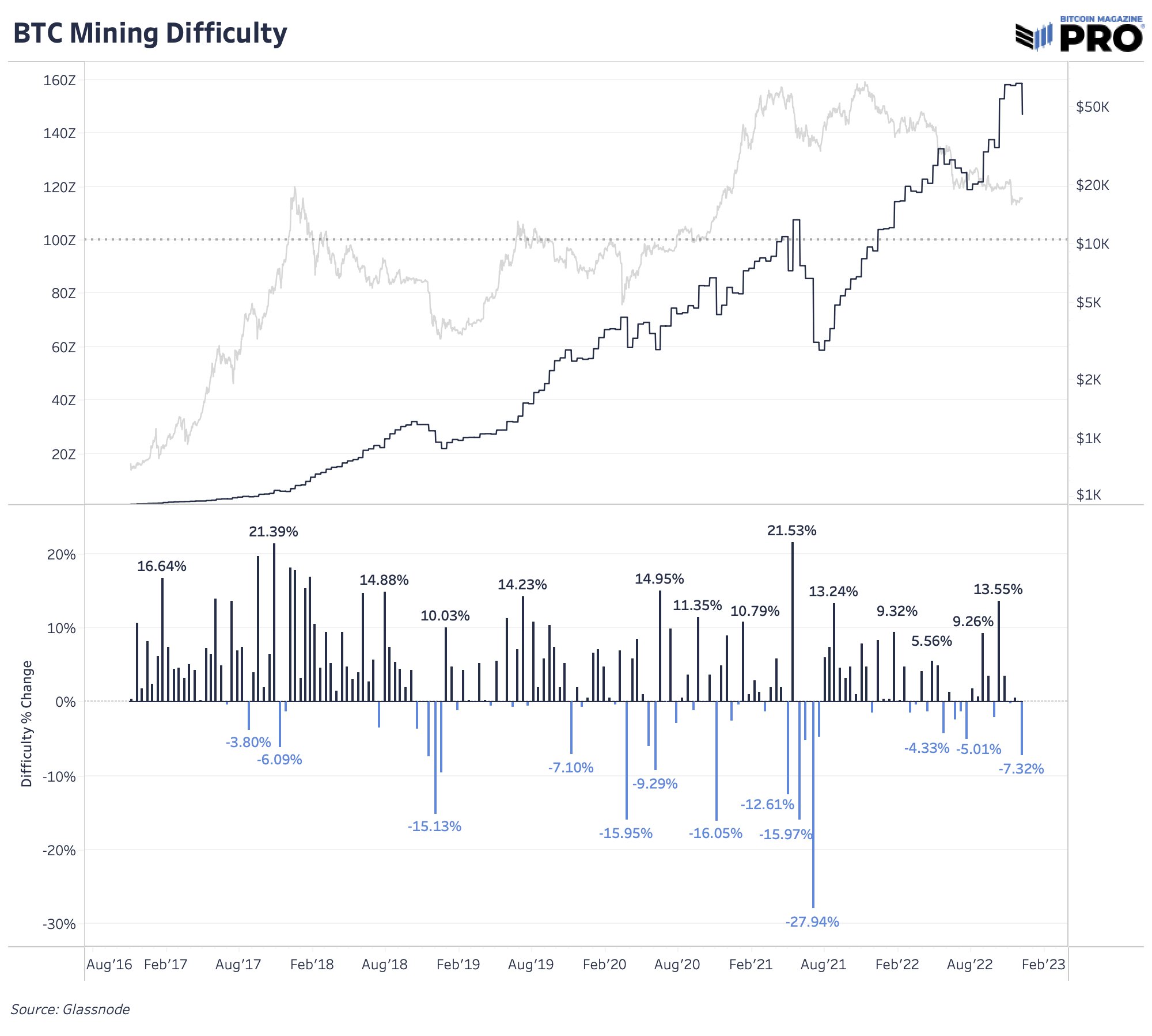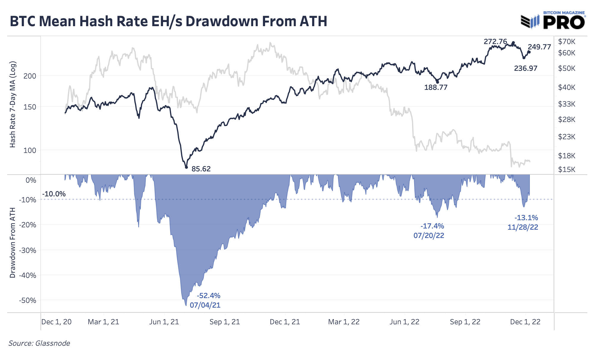 The mining industry continues to take a beating as rising energy inflation, debt burdens and depressed bitcoin prices take their toll. At the end of November, we saw a 13.1% decline in hash rate from all-time highs. However, of the major hash rate declines since 2016, that’s still relatively small compared to the handful of down periods over 15% during that time.