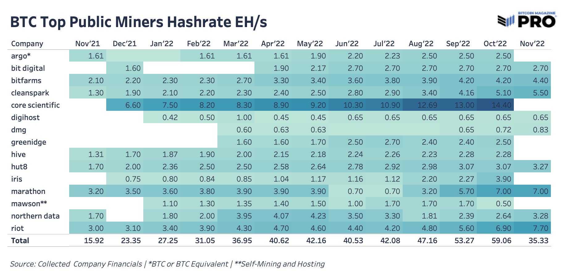 Even with the latest drawdown in hash rate, we’re not seeing announcements come from major public miners. Most public miners’ hash rate is either flat or is growing over the last month.