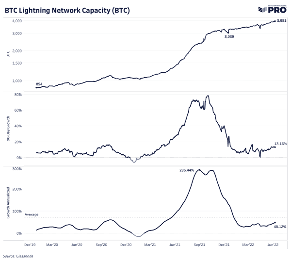 It is worth highlighting that the recent growth of the Lighting Network has come during a time where on-chain bitcoin fees have been extremely low, which partially reduces the economic incentive to use the Layer 2 solution to save on costs. This makes growth in public channel capacity over the course of 2022 (as seen by the 90-day annualized growth rates) all the more impressive.