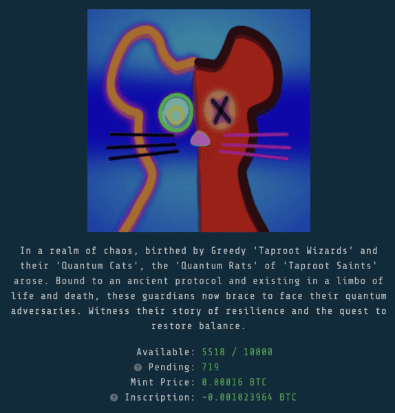 What I will NOT concede is the notion that ordinals and NFTs are unarbitrary—they are. I can take the jpeg of every Quantum Cat, and re-release the same 3000 cat collection, and tell people mine don’t cost 0.1 bitcoin each, but only 0.0001 bitcoin each. Such cheaper. Much better deal!! There’s nothing rare or special about it. Do people want to pay Udi or Sotheby’s the 0.1 bitcoin to own the address to the Sat to the cat in their collection, or the same cat in mine? In fact, a copycat collection has already been created trying to do just that, called Quantum Rats.