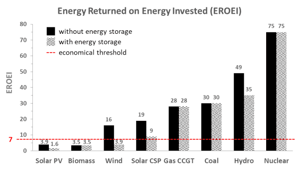 It is clear that wind and solar have EROEIs that are orders of magnitude below established electricity-production technologies. They consistently underperform those of hydro, nuclear and fossil fuel power plants, and when energy storage is included, their EROEIs further deteriorate.