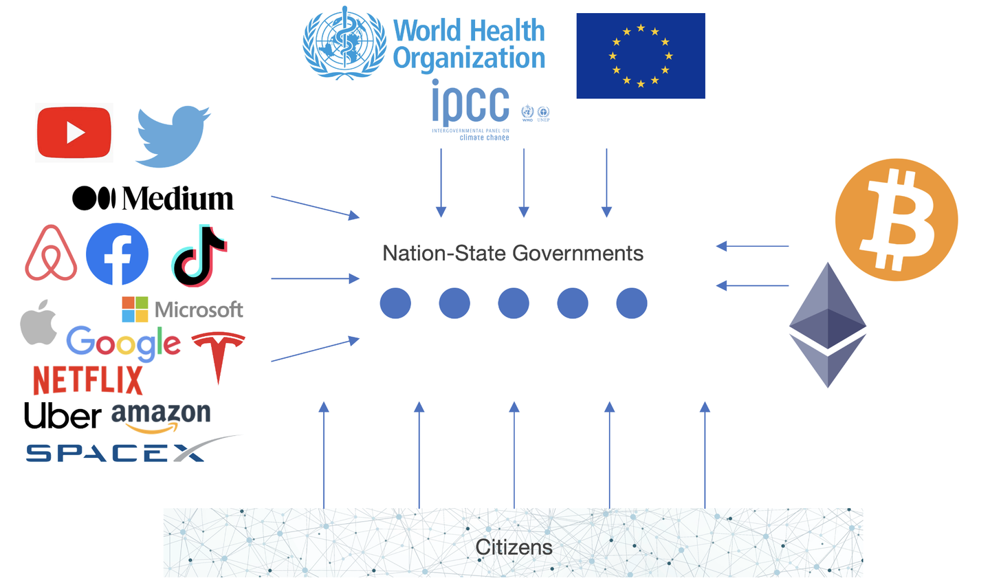 But why can’t a community emerge where citizens around the world can pledge support to the politicians who do want climate change policies? Why can’t they make that pledge a public, automatic commitment on the blockchain? It hasn’t happened yet because we haven’t gotten around to it. But it will. When that community emerges, will it be more or less powerful than nation states? Or simply another group that nibbles sovereignty away from nation states?