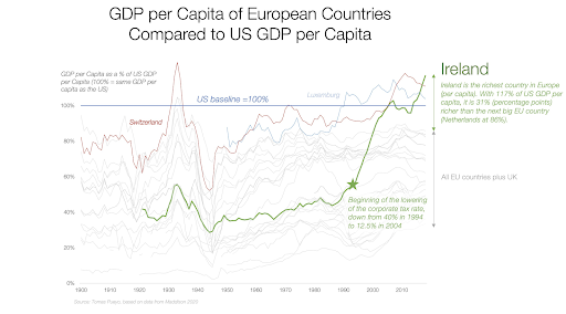 Before it reduced corporate taxes in 1995, Ireland was a pretty poor country. Now it’s the richest one per capita in Europe. This is mostly leprechaun economics, a reporting effect due to the oversize impact of big corporations — the average Irish person is not as rich. But it reflects how much Ireland has attracted companies thanks to lower taxes, companies that can then be taxed, even if just a little, thus filling the coffers.