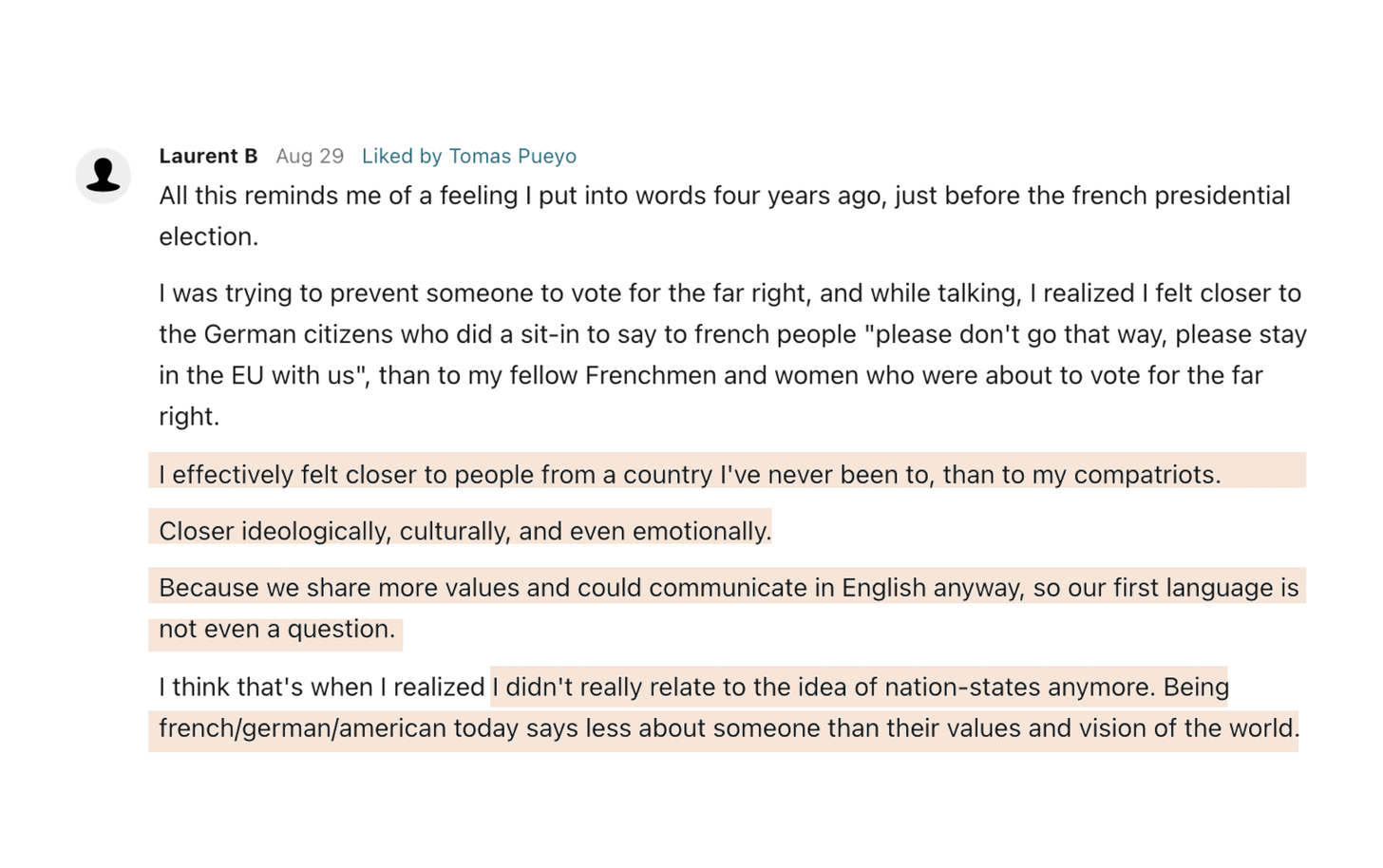 Now that people can talk with anybody in the world, exchange their ideas, find soulmates, and people who think alike, naturally their identity will outgrow nation states.