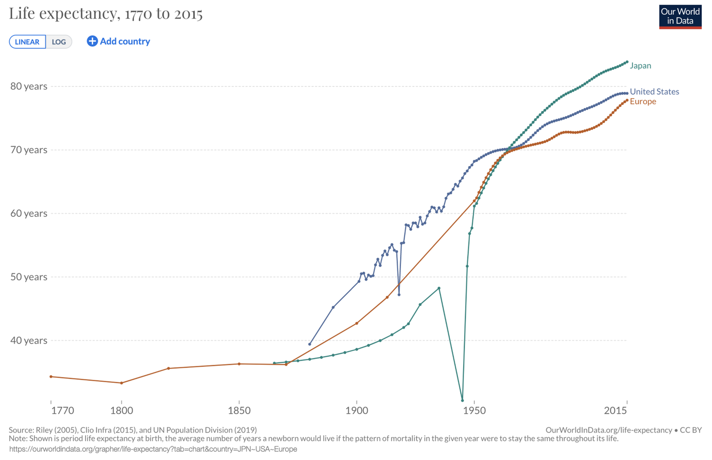 This graph means that a retiree in the 1980s in developed countries like Japan, China and the European Union had more than five workers to pay for her old-age benefits like healthcare and pensions. In Japan, every retiree only has two workers to support her. Europe will get there in 10 to 20 years. The U.S. will follow soon after.
