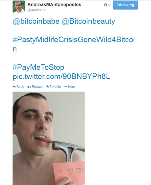 RA:Why do you think Andreas A. tweeted a pic of himself licking a hammer, topless, along with a note, and Bitcoin donation address?