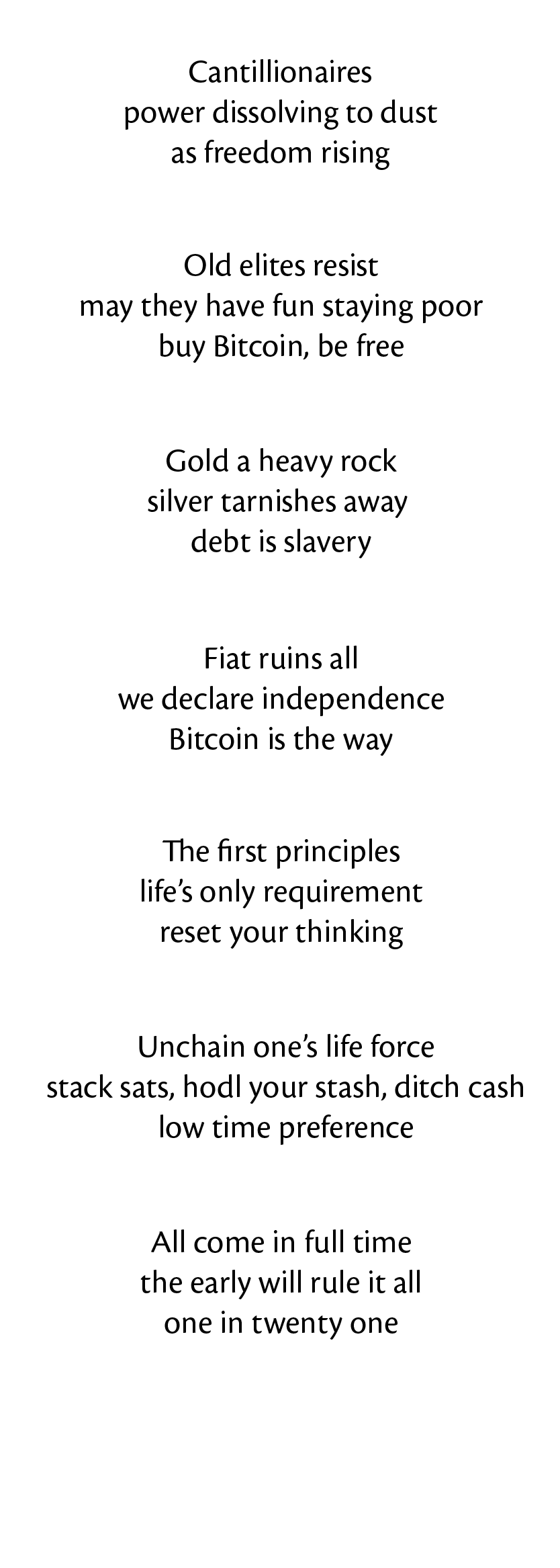 However, during that year, two interesting things happened to me. The first was that, in April, Colin Crossman introduced me to Bitcoin. I quickly went down the rabbit hole, as I almost immediately intuited that eventually, “Bitcoin fixes,” the absurdist forces which have seized power. The second was that, about a month ago, Mark Maraia read those throwaway limericks that I had posted, and asked me to write some verse in support of the Declaration of Monetary Independence.