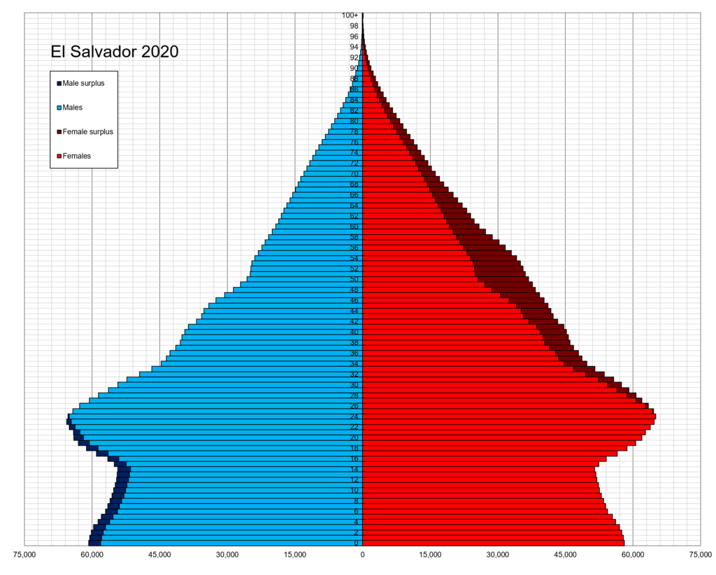 El Salvador’s demographic situation is excellent, it has the highest population density in Central America, and is part-way into the modern demographic transition. In the last 50 years, the fertility rate has fallen from six births per female to replacement rate today. High religious faith in the country may help keep fertility rates up, along with a rise in populism and nationalism globally. El Salvador may yet avoid a painful demographic transition.