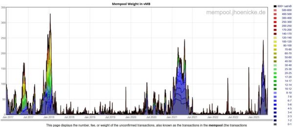 Note that the two previous spikes, around the starts of 2018 and 2021, coincided with the resolution of massive bull markets. From January of this year, the markets have been fairly calm and the latest spike is attributable to Ordinals. This raises the question of how horrifically high fees will get if the current Ordinals volume persists into the climax of another bull cycle…