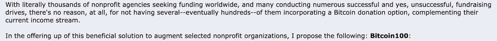 “Convincing a charity or non-profit to accept Bitcoins should be easier than a business so they are a good place to build mindshare. Charities aren’t selling anything, the risk of fraud is lower and they always need more donations.
