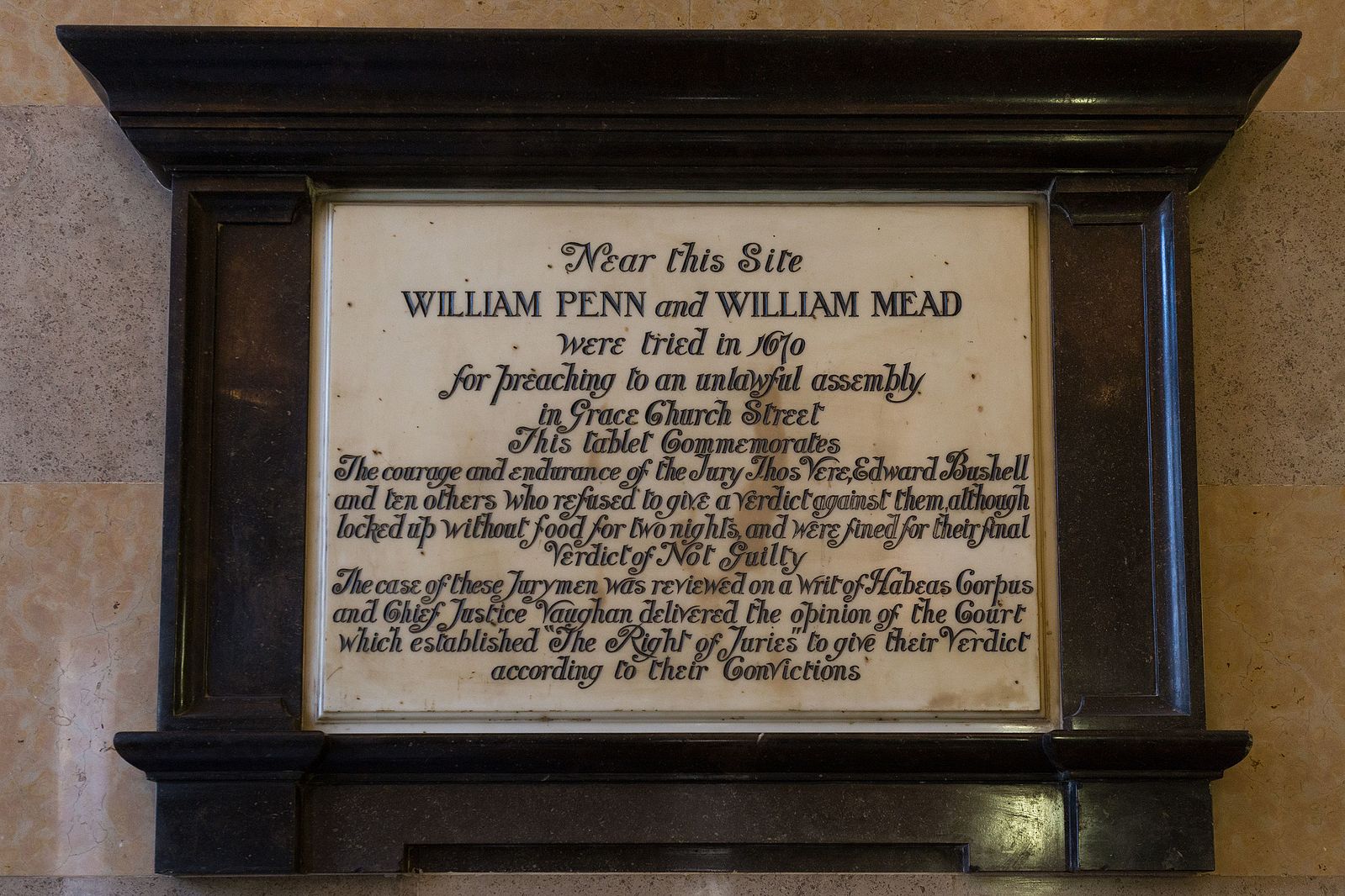 Historically, one of the most important instances of jury nullification was the trial of William Penn and William Mead. Taking place in 1670s England, the two were brought up on charges of preaching to an unlawful assembly. When the jurors tried to find them not guilty by jury nullification, they were thrown in jail, threatened, starved for two days and then, when they did not comply with the judge’s wishes, fined and jailed until they could pay the fines (for some of them, this meant months in jail). This instance is so important in history, in fact, that it is commemorated in a plaque hanging in the Old Bailey. This case, and others like it in the 17th and 18th centuries, played a pivotal role in the jury trial rights built into the U.S. Constitution.