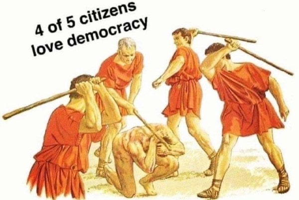 Democracies are nothing but legal, public monopolies, run by popularity contest winners with no skin in the game. They appeal to and always devolve into rule by the mob, where morality and the consequences of stupidity are socialized, and often paid for by the more productive members of society.