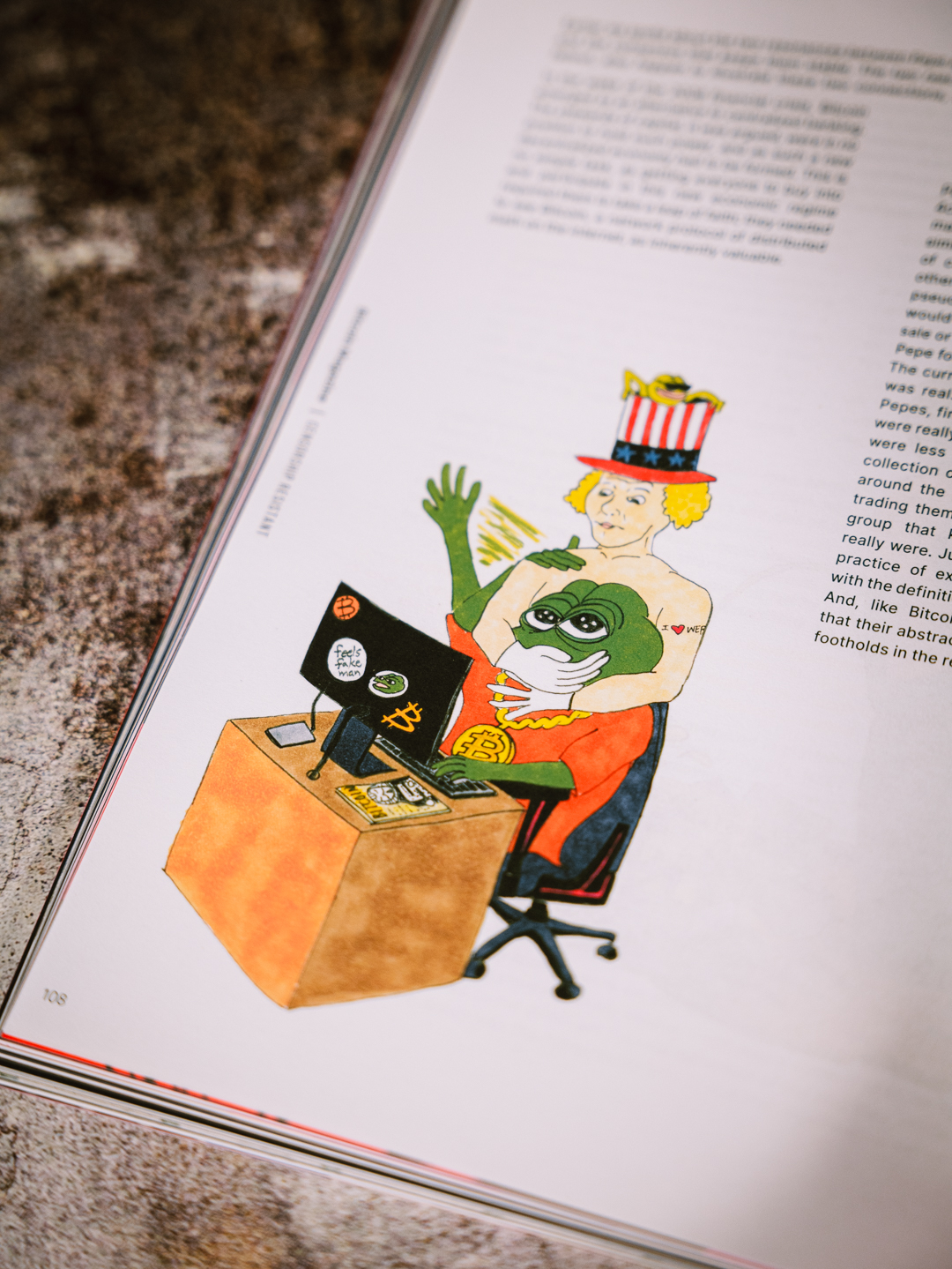 Pepe needed no such leap. In October of 2014, 4chan users began to post Pepes with watermarks saying “Rare Pepe – Do Not Steal” or similar messages as a tongue-in-cheek way of combating the spread of their memes to other platforms. As this went on, a LARP-y pseudoeconomy developed. Different users would create Rare Pepes and offer them up for sale or exchange to other users. Pepe for Pepe, Pepe for Good Boy Points, Pepe for tendies, etc. The currency was fake, but the symbolic value was real. The normies could have the normie Pepes, fine, but everyone knew the Pepes that were really worth something were the ones that were less common and accessible. Having a collection of Rare Pepes meant you had been around the places where they appeared, and trading them meant that you were part of the group that knew what the important ones really were. Just like Bitcoin, Wink told me, the practice of exchange was intimately tied up with the definition of its surrounding community. And, like Bitcoin, Rare Pepes quickly found that their abstract communal value was finding footholds in the real world.