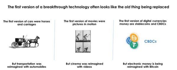 Going from physical cash to CBDCs and stablecoins is equivalent to going from photographs to moving pictures — a novel innovation but a semi-improved version of the old product. History shows us that semi-improvements are usually a transient innovation. Typically, these versions are replaced by innovations that can reimagine the future rather than recreate the past.
