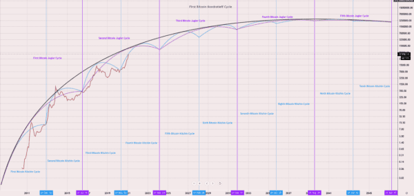 Figure 2 below illustrates the Schumpeterian Bitcoin cycle. The Bitcoin K-wave is shown in dark gray; the Bitcoin Juglar cycles are depicted in purple; and the Bitcoin Kitchin cycles, which correspond closely with the halving cycles, appear in blue.