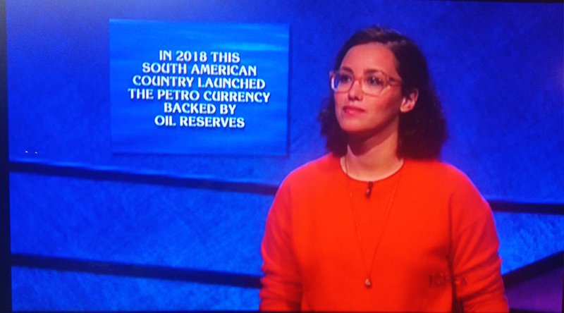 Ciccone chose to risk $2,500 of her $5,200 pot, and the clue that followed read, “In 2018, this South American country launched the petro currency backed by oil reserves.” After just a moment’s thought, she responded with the correct answer of “What is Venezuela?”