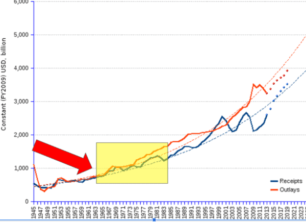 The period of time around 1966, when the Fed began spending more than it received in tax receipts, is highlighted below in figure 28.