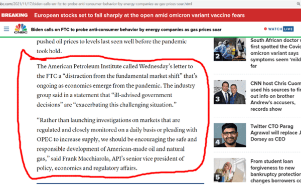 “The American Petroleum Institute called Wednesday’s letter to the FTC a ‘distraction from the fundamental market shift’ that’s ongoing as economics emerge from the pandemic. The industry group said in a statement that ‘ill-advised government decisions’ are ‘exacerbating this challenging situation.’