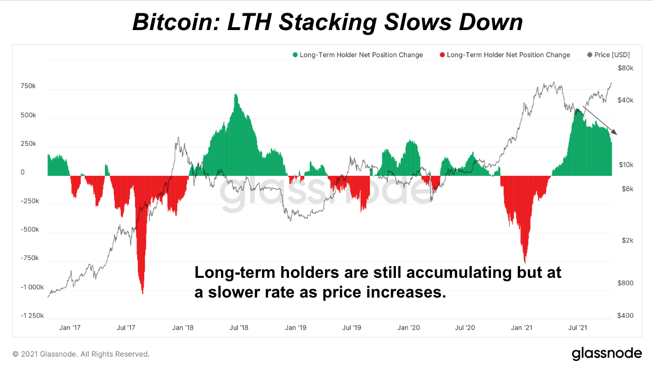 Over the summer, as the bitcoin price fell over 50%, bitcoin entered a mini-bear-market-type environment where long-term holders took the opportunity to stack supply at a rate that we haven’t seen happen before during a bull cycle.
