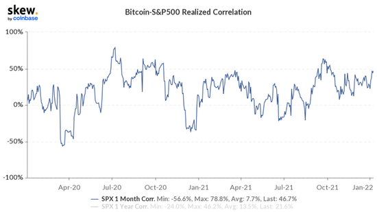 Currently the rolling one-month correlation between the two assets is +46.7%.
