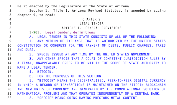 The bill seeks to add bitcoin to the list of instruments considered legal tender in Arizona and make the peer-to-peer digital currency a lawful medium of exchange there, enabling citizens to pay debts, public charges, taxes and dues with BTC.