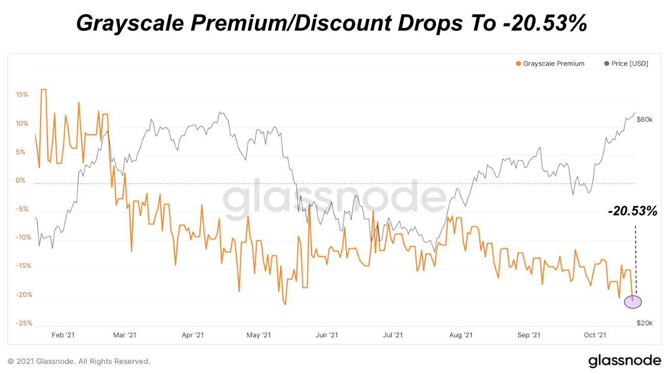 The market’s expectations on if we are getting a spot ETF can be tracked via proxy through the Grayscale Bitcoin Trust premium/discount rate. As the likelihood increases of a spot ETF coming to market, we would expect to see the current significant discount of 20.53% move closer to 0. If Grayscale is able to convert its trust into a spot ETF, which has been its long-term strategy, investors have additional upside to the bitcoin price through buying these discounted shares. But since July, the discount has been in decline and fell an additional 5.4% this week.