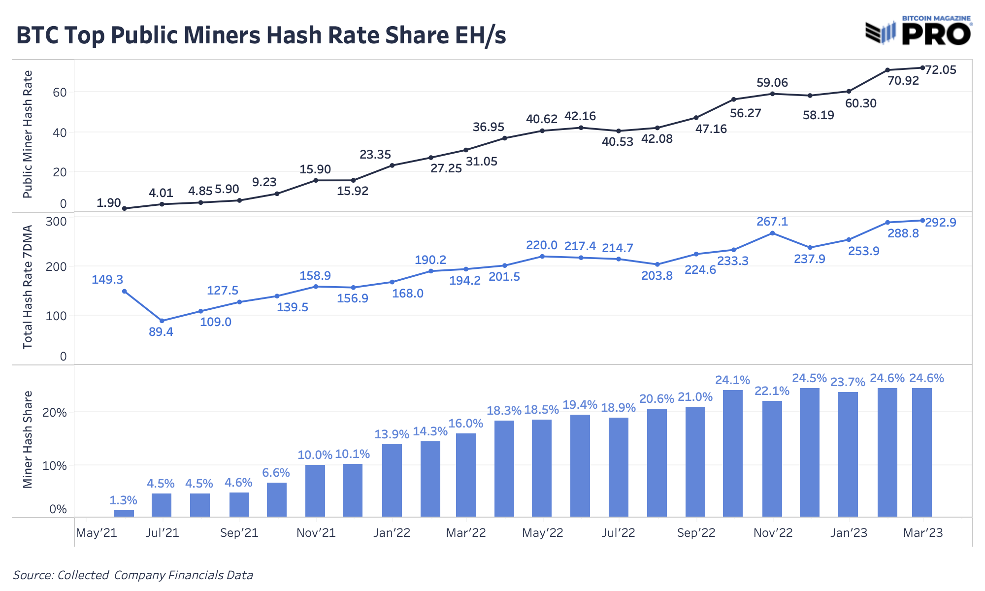 Hash rate in aggregate continued to steadily rise over the last few months while bitcoin holdings continued to decline. When we use the reported numbers for public miners’ hash rate at the end of February, the 292 EH/s at the end of February and the 350 EH/s online today, we conclude that public miners make up somewhere between 20% to 25% of total network hash rate on a given day. That’s likely a low estimate considering there are some smaller public miners we’re not tracking and public miner data is released periodically.