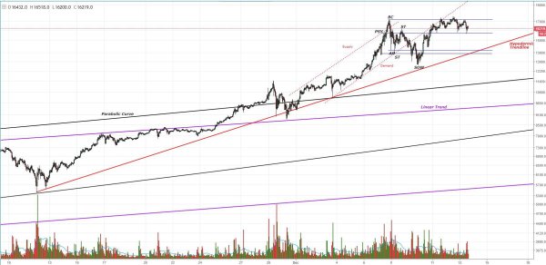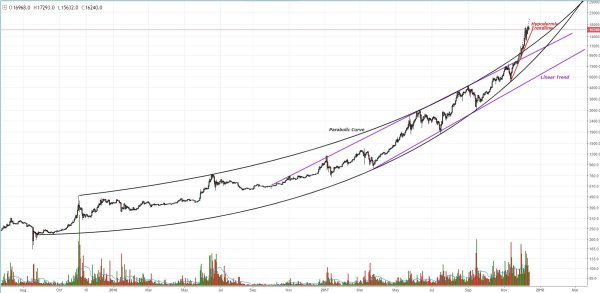 Bitcoin prices have currently stalled out in the $16,000s as the market decides if it wants to continue the ravenous bull trend or go through a more corrective phase. In the last 30 days, the price of bitcoin has doubled — entering into what most traditional market analysts would deem “bubble territory.” Bitcoin’s growth has been so rapid, it has managed to break north out of a parabolic trend to form an even more aggressive parabolic shape known as a “hypodermic trend.” Let’s take a look at the macro view of bitcoin and see if this trend is sustainable or ripe for a correction: