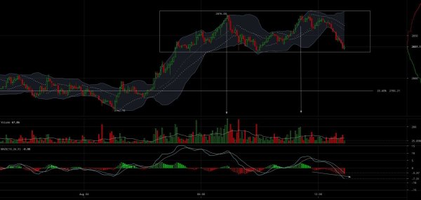 The high $2,600 values (also the 23.6 percent Fibonacci Retracement line) have historic significance in this market because they are firmly established support values. However, if we look at the 6-hr volume trend, we can see that each rebound off the $2,600 values was paired with decreasing volume on every attempt to break support. The volume trend shown above is typically a sign that the market is no longer confident in the higher price values and will ultimately need stronger volume to break new highs.