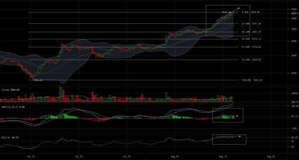 At the top of BTC-USD’s strong run from the $3200s stands a classic bullish continuation pattern called a “Bull Pennant.” The pennant is characterized by price consolidation within a convergent pattern and has decreasing volume throughout the length of the pennant body. To accompany this pattern is a 1-hour RSI and MACD that began to consolidate toward its centerline.