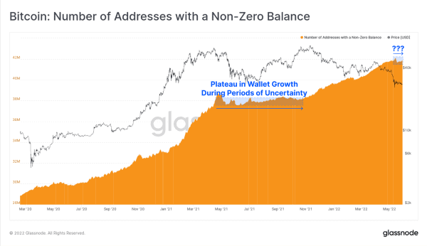 Wallet growth also appears to be on the rise. With a little blip of noise on the right tail, the trend is obviously up and to the right, experiencing a nearly 45% increase over the past two years.