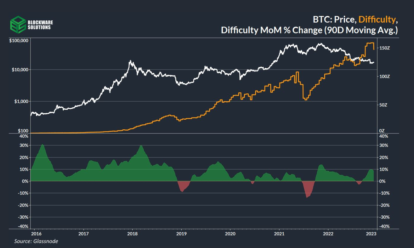 This is taken into account as well in the subsequent theory that Bitcoin hash rate growth will slow progress in 2023, noting three factors: