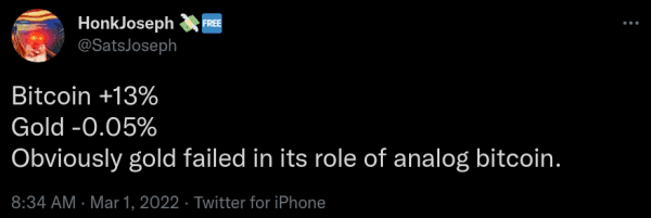 The most recent fall in bitcoin’s price at the outset of the Russian-Ukrainian conflict was no exception to the rule of nocoiners burying Bitcoin at every occasion. We saw a lot of tweets like the one below, accompanied by articles on mainstream media such as CNBC’s “The Case For Bitcoin As ‘Digital Gold’ Is Falling Apart.”