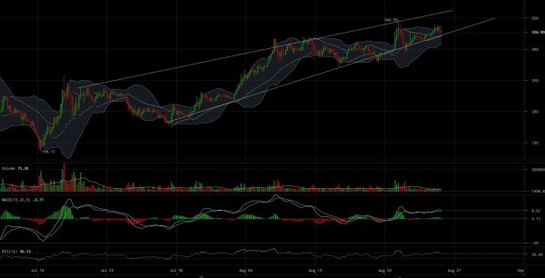 The MACD and RSI momentum divergence is visible within a bearish pattern known as an “Ascending Wedge.” Currently, the market is attempting to break to the bottom of the wedge and shows moderate signs of sell volume increasing upon the breakout point. A sustained breakdown of this pattern would give an approximate price target of the low $300 values.
