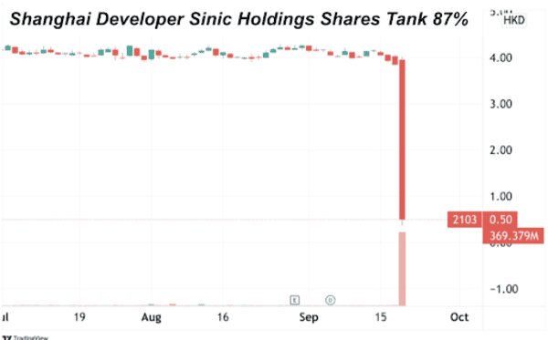 Shares of Sinic Holdings Group Company, a Shanghai-based real estate developer, plunged nearly 90% on massive volumes (approximately 14 times above average trading volume) before trading was halted. In an article published by Bloomberg, Philip Tse, director and head of Hong Kong and China property research at Bocom International Holdings Co Ltd. said the following,