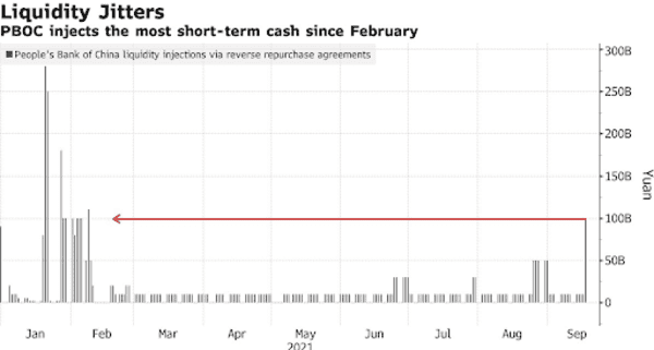 So far, the largest contagion spread impacts show up in China’s over-leveraged real estate sector with equity and bond sell-offs happening amongst other top property developers like Country Garden Holdings and Sunac China Holdings. The next level of contagion spread would show up in the Chinese banking sector amidst a liquidity crunch. On Friday, The People’s Bank of China injected 90 billion yuan ($14 billion) of funds, the most since February, to provide short-term liquidity into the banking system.