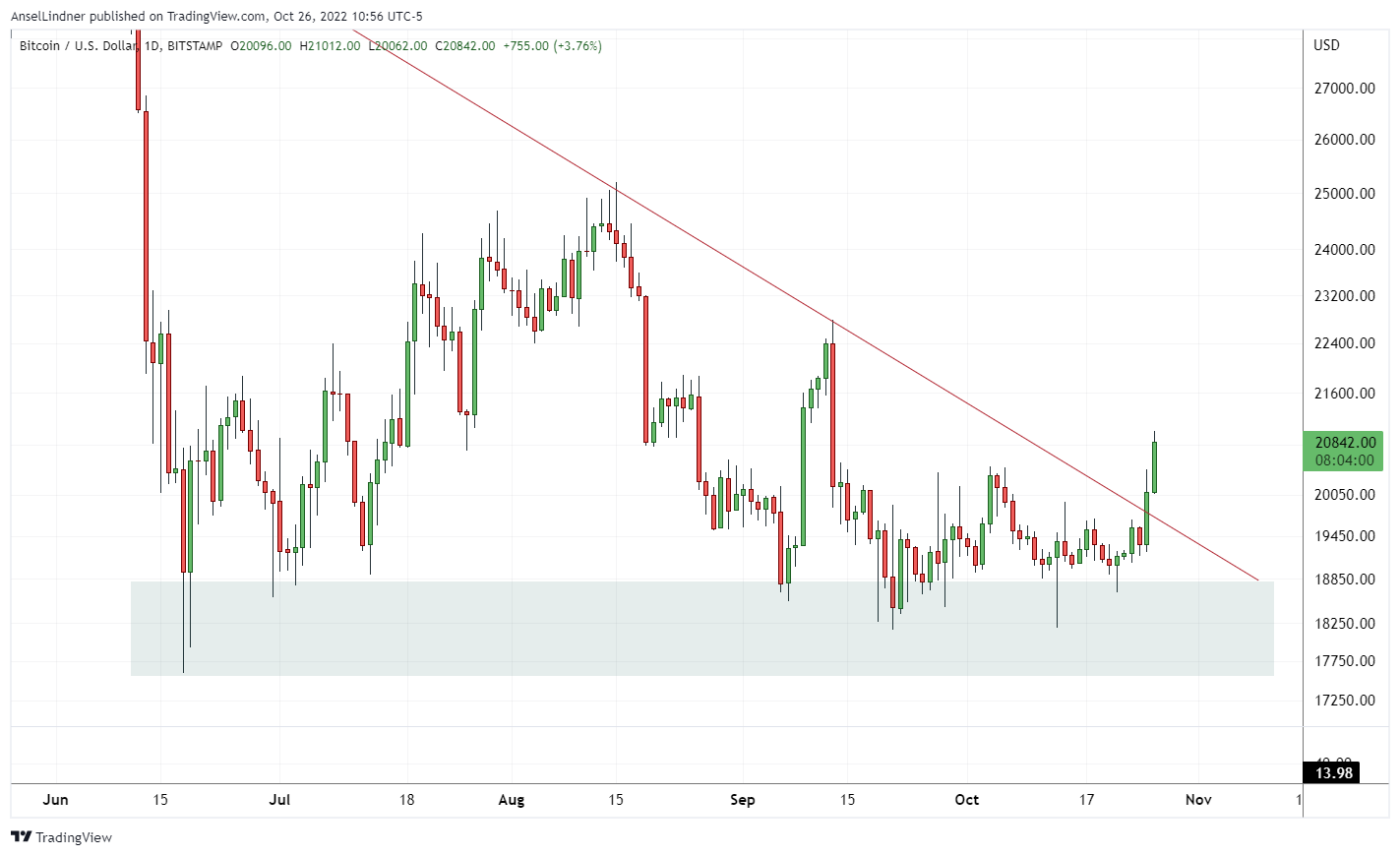 During the week of October 24, bitcoin made a nice move upwards, out of the triangle pattern we’ve been watching for weeks. During the show, I clarified that the lack of confirming volume on this breakout shows that it could be a fakeout and it could still roll over and go lower.