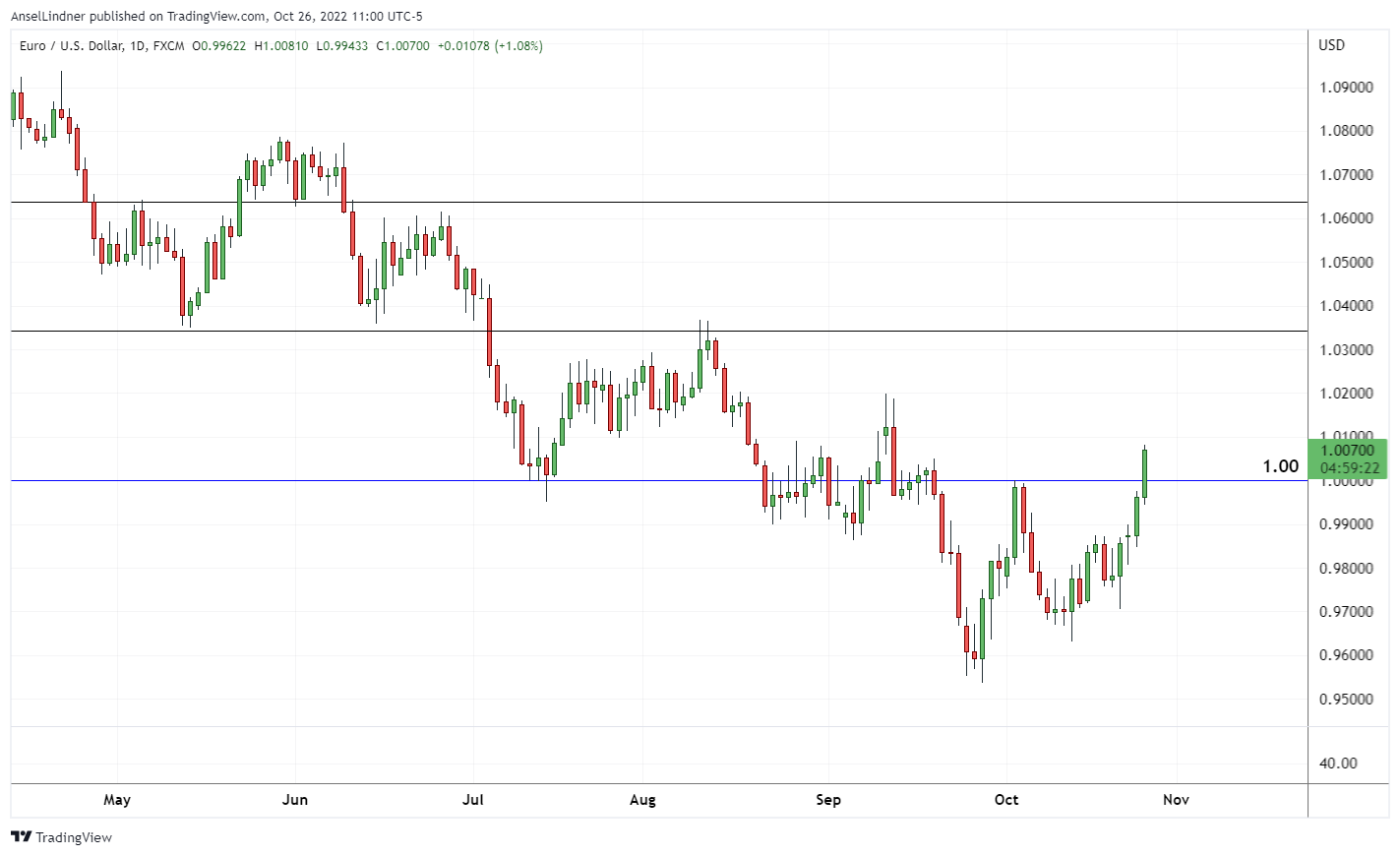 The euro is back above parity with the dollar, exhibiting higher highs and higher lows — looking strong.