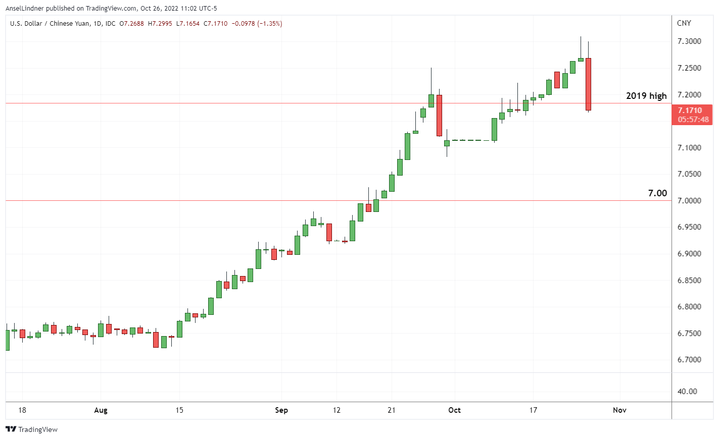 Finally, the Chinese yuan. The rumors are that the Chinese government ordered intervention in the yuan to attempt to strengthen it against the dollar. The chart shows a big red candle in late September, followed by a week of apparent manipulation to peg the exchange rate. Immediately after that, the yuan continued its pattern of devaluation. Then, on the day of recording, there was another large red candle, likely the result of intervention. Whatever the reason, the yuan is stronger against the dollar today than last week.