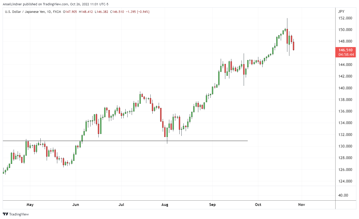 Using an inverse chart to the euro chart above, the Japanese yen is 4% off its weakest and looking like it also wants to strengthen in the near term.