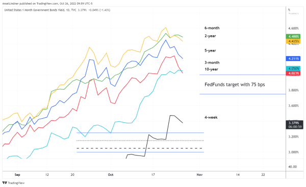 Below is my rainbow yield curve chart. I labeled each in their vertical order. You can see the 3-month/10-year inversion. I also added the fed funds rate and the future fed funds range after the upcoming FOMC meeting (if they raise 75 bps again).