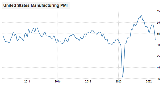 Measured across new sales orders, input costs, employment, work backlogs and business confidence, PMI (Purchasing Managers’ Index) survey data acts as a timely and leading indicator to assess economic health. The latest PMI reading came in this morning at an extremely ugly 52, below expectations of 56. The slowdown in manufacturing can be attributed to sharp rises in the costs of energy and commodities at the same time that rates are increasing at a record pace.