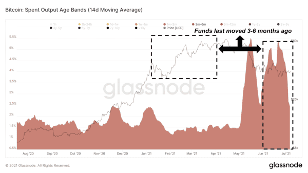 On-chain data shows that a notably large amount of UTXOs in the age range of 3-6 months have recently moved, which further supports the notion that buyers from within the range of $40,000-$60,0000 have been capitulating.