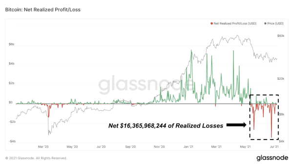 Over the last 55 days, there has been a historic amount of losses on the Bitcoin network. Over $16 billion worth of losses have been realized since May 13.