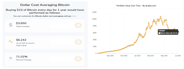 This further highlights the simplicity and elegance of dollar-cost averaging into a bitcoin position. A simple daily dollar-cost average strategy would have you up 71.02% year over year.