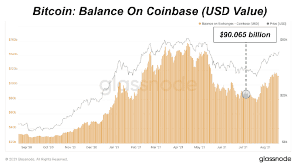 The company reported having $180 billion worth of assets held on the platform at the conclusion of the second quarter, and using data from Glassnode, we can see that there was approximately $90 billion worth of bitcoin held on Coinbase at the same date.