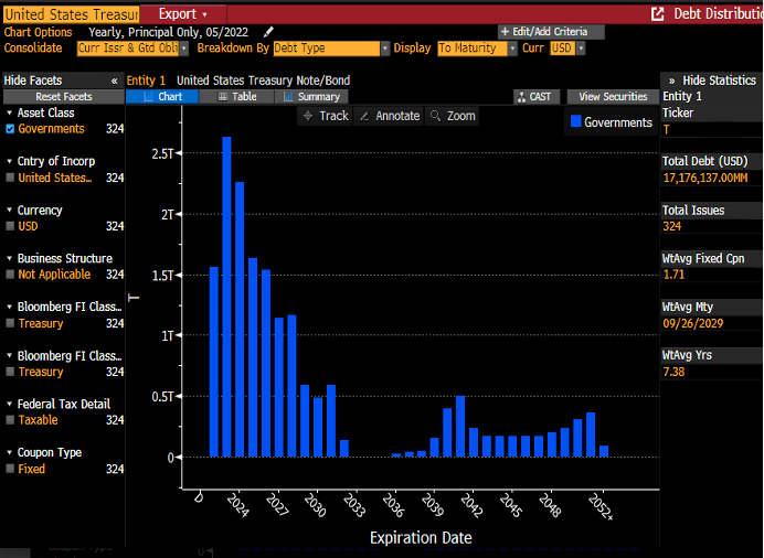 Last week, we discussed the fact that credit default swap spreads for sovereign nations are becoming completely detached from their historical averages. In that piece, we highlighted that rapidly rising rates will begin to have a material effect on the interest payments on sovereign debt. Our friend Lawrence Lepard did some rough calculations on the exact impact this type of high-rate environment will have on the amount of money the U.S. government will owe their counterparts in interest payments if rates continue to rise. At this rate, interest payments will be about 3.5 times what they were in 2020. Of course, this won’t happen right away as a lot of these Treasurys need to mature. However, if you take a look at the maturity calendar, a considerable amount of these Treasurys are due to mature over the next two years.