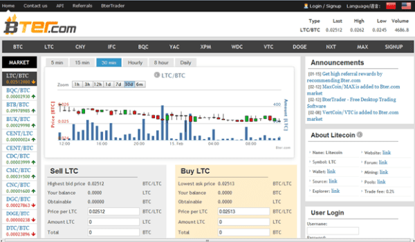 English and Chinese languages are supported on the website. It can, unlike other Chinese exchanges, accept Chinese Yuan directly. The most notable difference for this exchange is the use of several alternative (alt) coins. Compared to US based Cryptsy, the trades were quicker without the lag time common on Cryptsy.